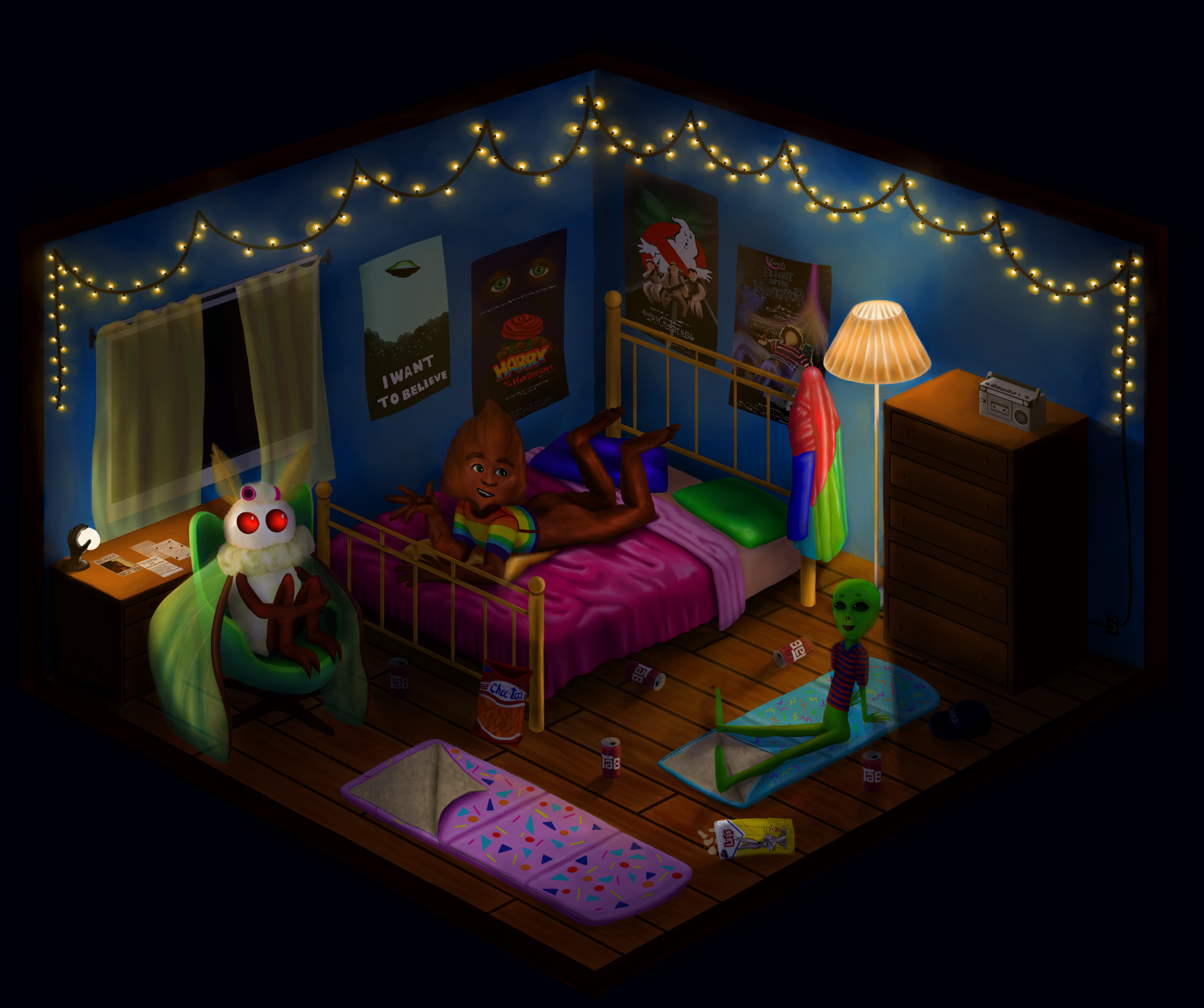 Here are headshots of all the characters that are apart of this group of friends. Each one has their own quirks and weird traits. I created each character to have their own unique defining color pallet and features that set them apart from the others.